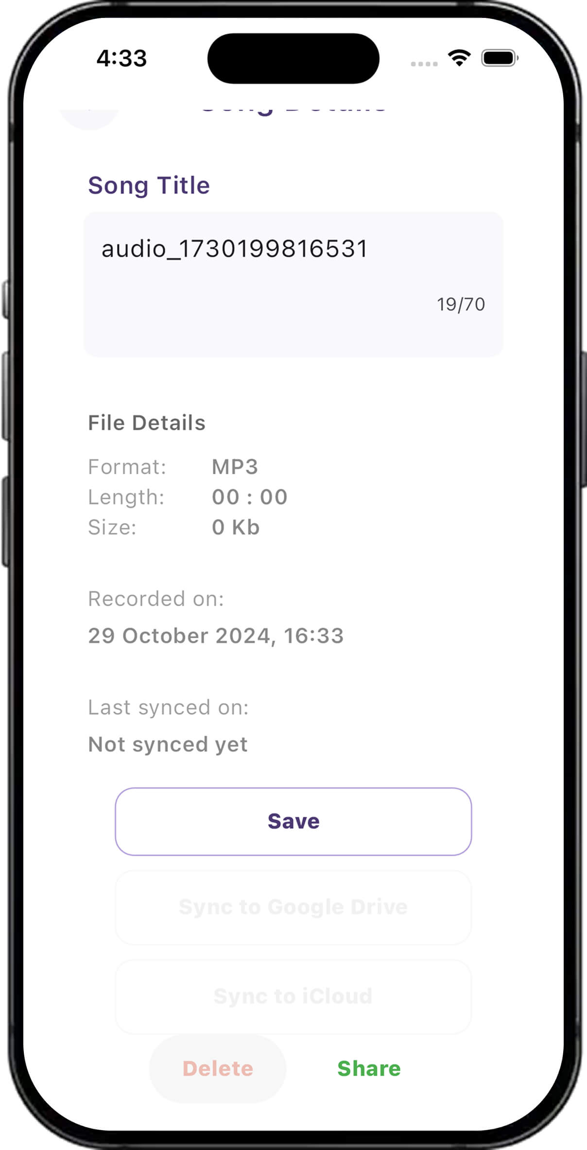 With Google Drive integration, you can sync your songs to the cloud, making them accessible anywhere, anytime, and easy to share with friends and family for feedback. Our delete account request feature puts you in control, allowing you to manage your data and experience effortlessly. Plus, with multi-device support, your inspiration can flow no matter where you are.